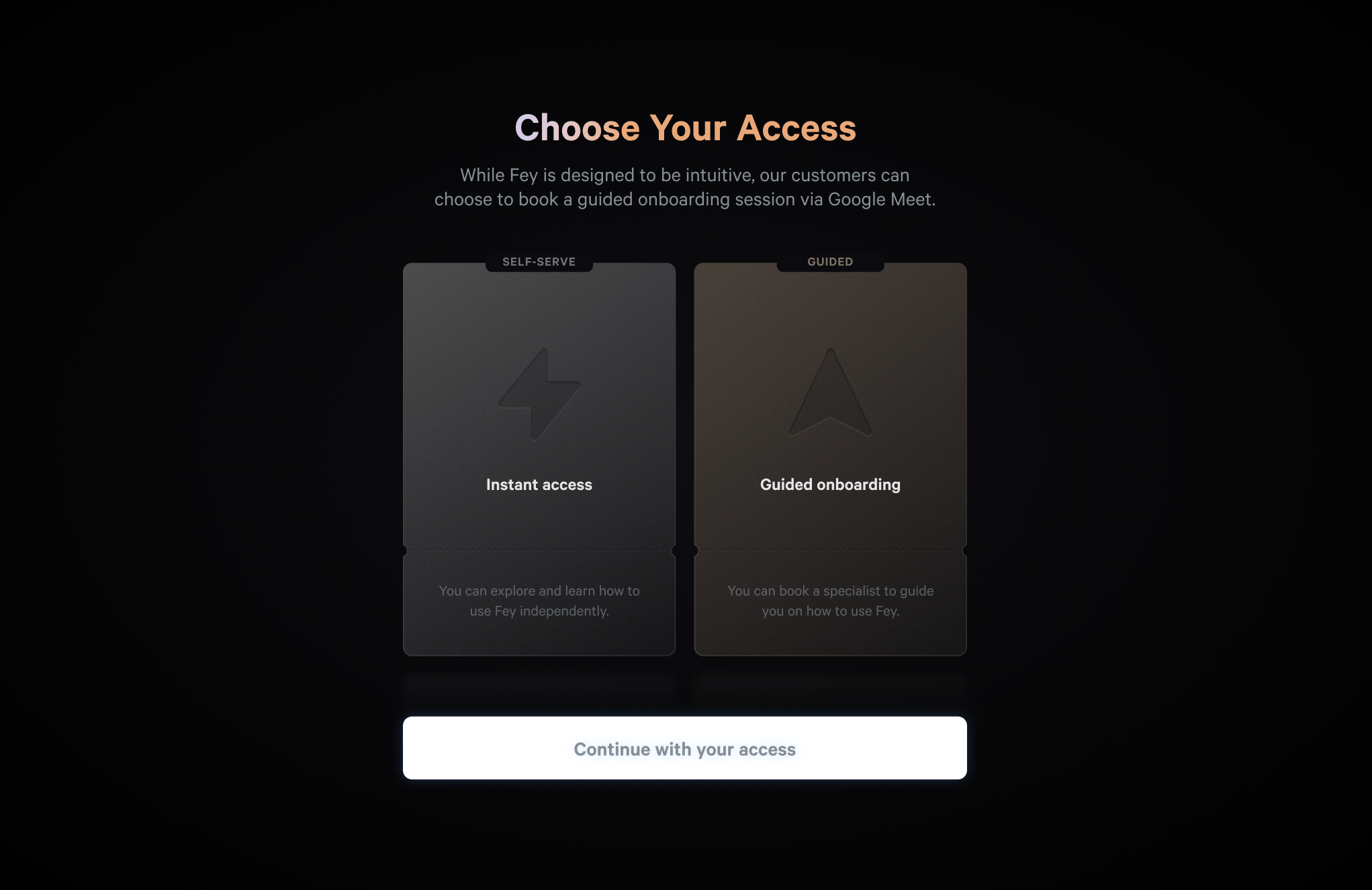 Effective onboarding is crucial to introducing our users to a new product. While our team aims to connect with customers and demonstrate how to leverage Fey for maximum benefit, we understand that busy schedules may hinder the ability to schedule onboarding calls. To address this, we have developed a self-serve system that enables users to easily grasp the product's features and functionalities, without the need for a call. The self-serve system still provides direct access to our team through various channels such as Slack or in-app feedback, ensuring customer satisfaction and retention rates remain a top priority.